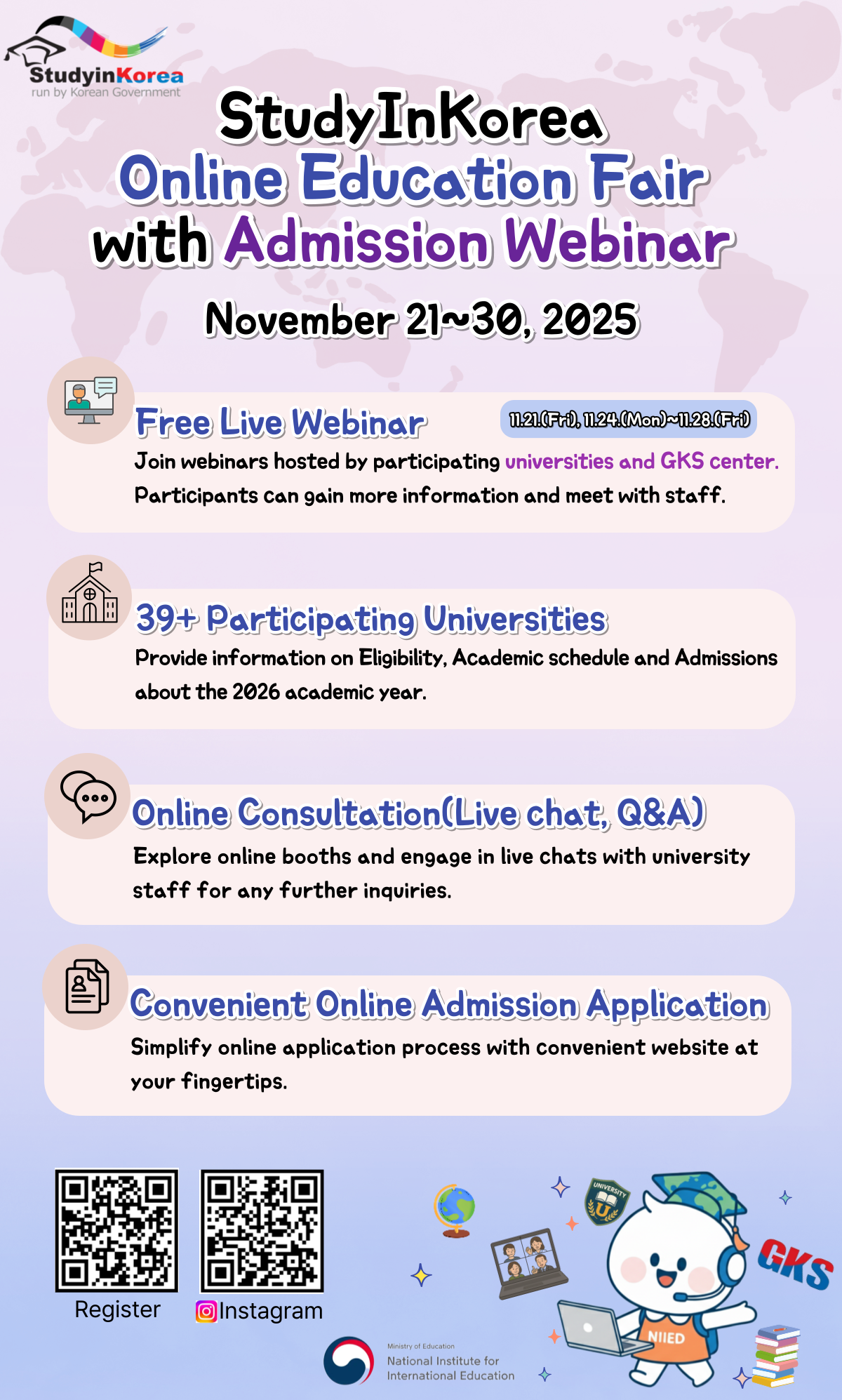 2026학년도 입학전형 정보를 제공하는 '2025 웨비나 입학설명회'를 아래와 같이 개최하오니, 한국유학에 관심이 있는 외국인들은 참고하여 주시기 바랍니다.